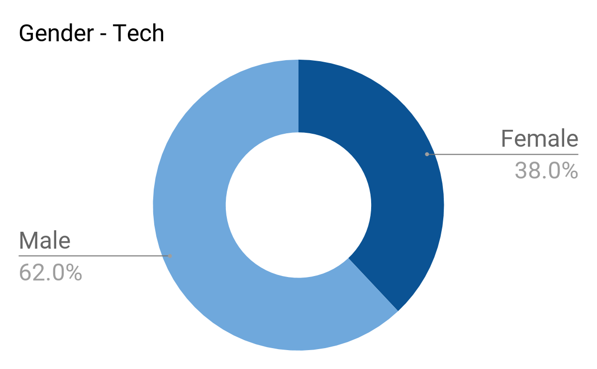 - We separate our statistics into tech — which includes engineering, product, and data science — and non-tech, which includes (but is not limited to) marketing, content, operations, human resources, and design. We do not separate the demographics for other functional groups because their small size precludes anonymity.